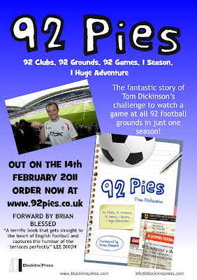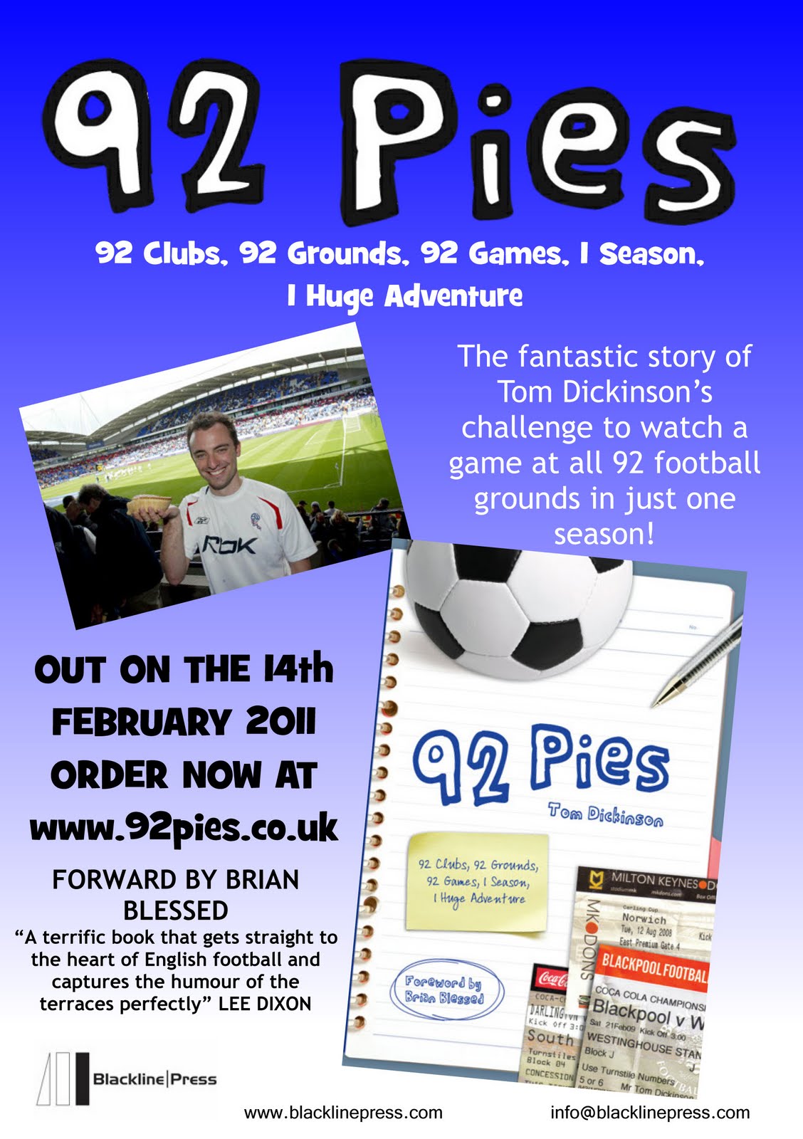 Independent football book publishers Blackline Press are about to launch their 5th book - 92 Pies. It is the fantastic tale of Tom Dickinson's challenge to watch a game at the 92 league grounds in just ONE season.
